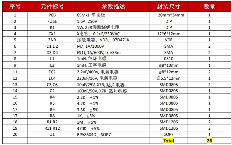 BPA8504D 芯片:SOP-7 封裝,集成 650V MOSFET 和 PWM 控制器。
