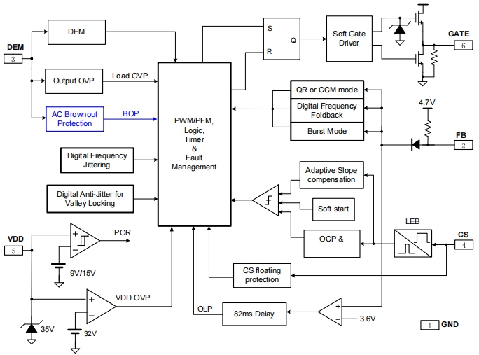 全面的保護功能:包括欠壓保護、過壓保護、逐周期電流限制、過載保護等,確保電源系統(tǒng)在各種異常情況下都能安全運行。