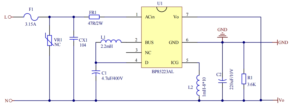 BP85223AL 的電路設(shè)計非常簡潔,其 BuckBoost 拓?fù)浣Y(jié)構(gòu)支持多種應(yīng)用場景。以下是其典型電路圖:
