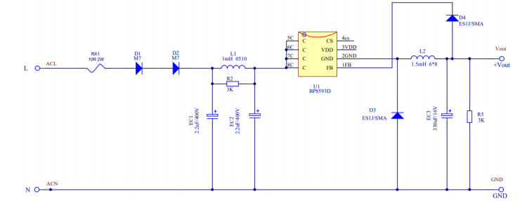 在智能家居、小家電、MCU待機(jī)供電等超小功率場(chǎng)景中,非隔離輔助電源因成本低、體積小、設(shè)計(jì)簡(jiǎn)單而備受青睞。過(guò)去,OB2222E曾是這類100mA級(jí)方案的主流選擇,但受限于交期、價(jià)格及EMI裕量,工程師急需一顆直接替換、性能更優(yōu)的新品。BP8593D以 SOP7封裝、內(nèi)置700V MOS、PSR架構(gòu)、<100mW待機(jī)功耗為核心賣點(diǎn),官方參考設(shè)計(jì)5V/100mA已完整驗(yàn)證,BOM、PCB、測(cè)試數(shù)據(jù)一步到位,可實(shí)現(xiàn)零調(diào)試替代OB2222E。本文帶你一圖看懂這顆“小鋼炮”。